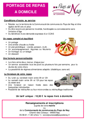 Le service de portage de repas à domicile de la Communauté des communes du pays de Nay, s'adresse aux personnes qui résident dans une des 29 communes de la communauté des communes.