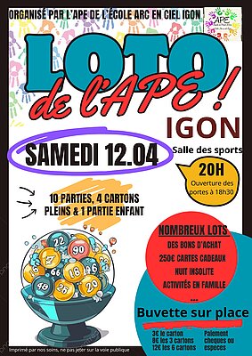 Un Loto organisé par l'APE de l'école Arc en Ciel aura lieu le samedi 12 avril 2025 à la salle des sports à 20h00.
